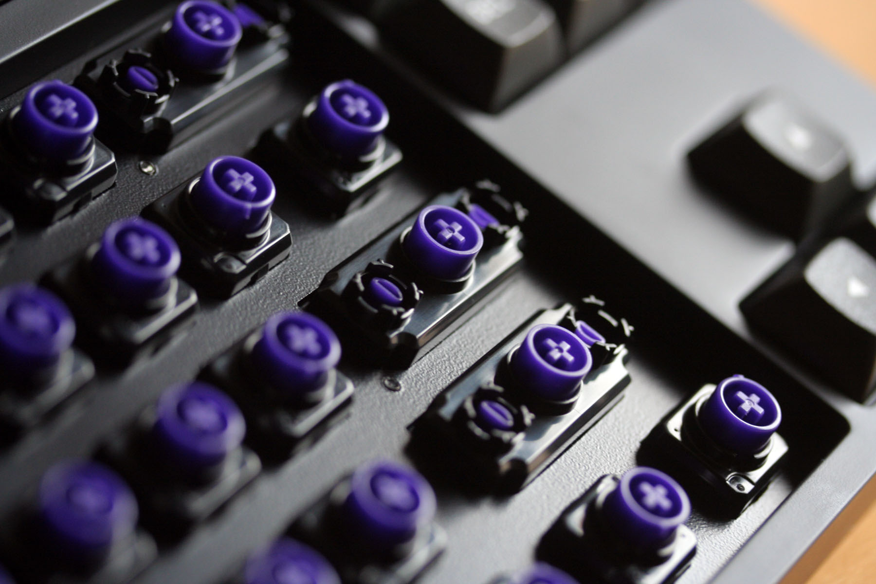 The colours of those two purplish ones are evidently quite different, but I can't seem to work out why there would be two purple/violet Gateron switches that don't have more or less the same coloured stems. Do you have any idea what those might be? Is one a 65 g Zeal and the other a 78 g Zeal or something? The lighter coloured (and lighter weighted) one was my partner's preference; personally I thought it felt pleasantly tactile but was badly in need of lube, whereas the darker coloured one was smoother but a little too heavy. There was also audible "spring ping" off the lighter ones, but not off the dark/heavy ones.